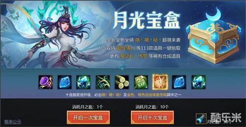 仙术师们可以消耗月之匙打开宝盒,开启一次宝盒将消耗1把钥匙,可以一次性消耗10把钥匙连开十次宝盒,即十连抽。十连抽奖池将升级,必出萌萌哒及金色、橙色自选装备宝箱其中之一,月之匙可以通过商城购买也可以通过活跃度礼包奖励获得。