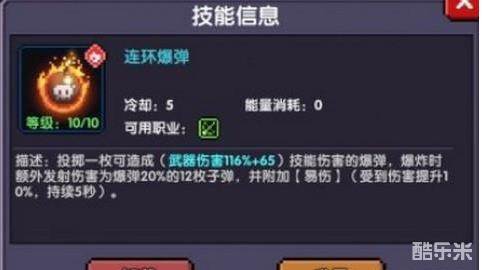 描述:投掷一枚可造成(武器伤害16%+65)技能伤害的爆弹,爆炸时额外发射伤害为爆弹20%的1枚子弹,并附加【易伤】(受到伤害提升10%,持续5秒)。