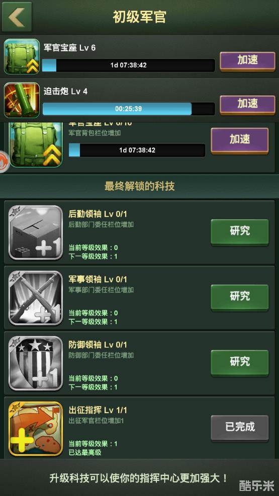通过在研究室研究“核心”和“军官”科技,最终解锁“领袖系列”科技。研究完后,就可以增加为人上阵军官的数量了哦!