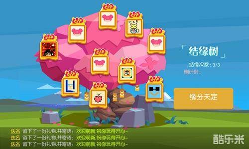 在广场最高点有一颗【结缘树】,点右侧【结缘】的灯笼可以领取各玩家留下来的礼物