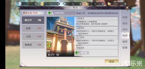 如果作为帮派的高层,除了基础的建设外,还要担心帮众的活跃,关注帮派的内政管理,帮派需要帮众的贡献才能够成长,管理可以通过修建工坊来获取帮派资金,帮众参与活动的话也可以产出一些帮派资金,帮派资金积攒到一定数量之后,管理才可以升级自己的帮派等级,等级越高,能够容纳的帮众就越多。