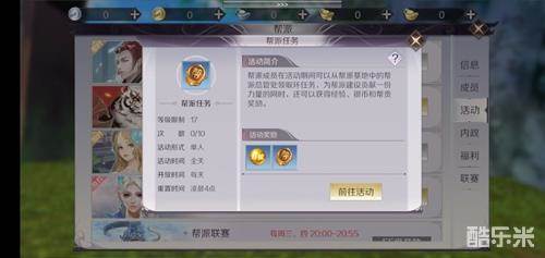 帮派任务(日常任务):日常任务没有特别难做的地方,却是经验和帮贡的主要来源,玩家在帮派总管处领取任务之后,就可以开始每天的跑环,跑环任务难度很低,但是非常琐碎,往往是支援帮众,派送物品等杂活,大家刷完其他活动后有充足的时候可以考虑帮派任务。