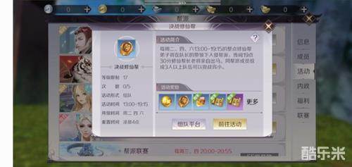 决战修仙帮(群殴NPC):决战修仙帮只在每周二、四、六13:00-19:15开启,在这段时间内,玩家可以组成一个三人以上的小队进入副本与修仙帮对战,胜利之后可以获得经验与帮贡,传闻19点30分修仙帮的长老将亲自出动,如若击杀可以获得不一样的奖励。
