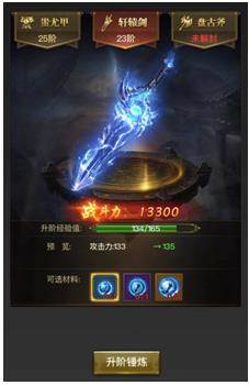 游戏中神兵分为蚩尤甲、轩辕剑、盘古斧,需要收集对应的神源才能进行解封和升阶锤炼