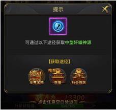 而神源分为小型、中型、和大型神源,神源可以通过开启至尊宝箱、商城购买、行会商店购买获得,而大型神源只能通过活动获取。