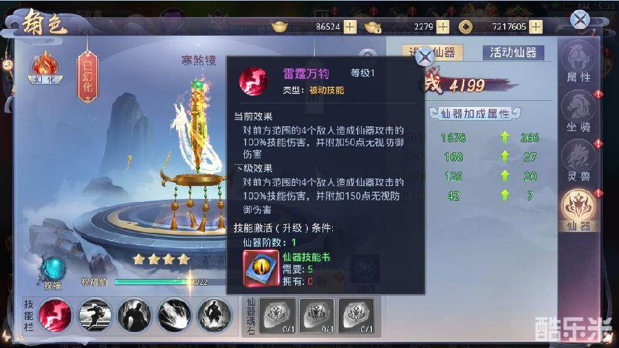 仙器共有5个被动技能,第一个技能会在解锁仙器的同时自动激活,而其他的四个技能则分别在仙器达到3,5,7,10阶时激活,激活仙器技能可以提升仙器属性,同时达到提升总体战力的效果,所以,想要快速提升战力的仙友们,还墨迹啥呢?赶紧去升阶升阶你的仙器吧~