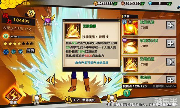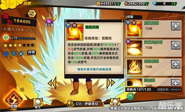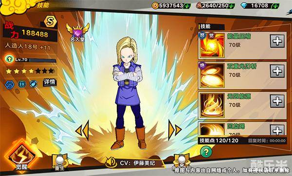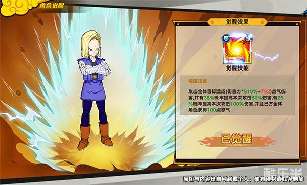 18号并非一个纯输出角色,这从她的必杀技说明就能看出来。除了能给敌方造成全体伤害外,还有概率增加我方全体人员的怒气值,将全员的必杀输出时间提前,更有效率地结束战斗。虽然增加怒气值的特效不是必定触发,但加上18号的无限能源作用,在进行持久战时就有很大几率让我方追加多次用必杀技的机会,这也还原了人造人能适应持久战的设定。