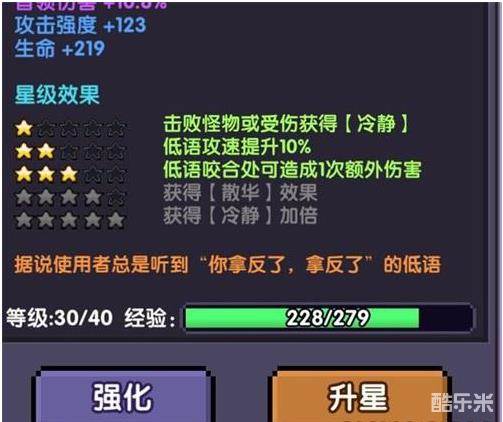 比如说你想要为你的红武升星,你得准备与红武相同星级的装备(星级可以在武器图标的右下角看到,没有星星就是零星,可以用同样没有星级的装备升星),这样你就可以为武器升星,就这样,随着一级级升上去,你也可以解锁新的武器效果,同时也可以提升武器最高级别。