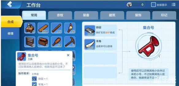 2、道具制作:工作台中使用铁锭*1、羊角*1即可合成,羊角可通过击杀羊获得。
