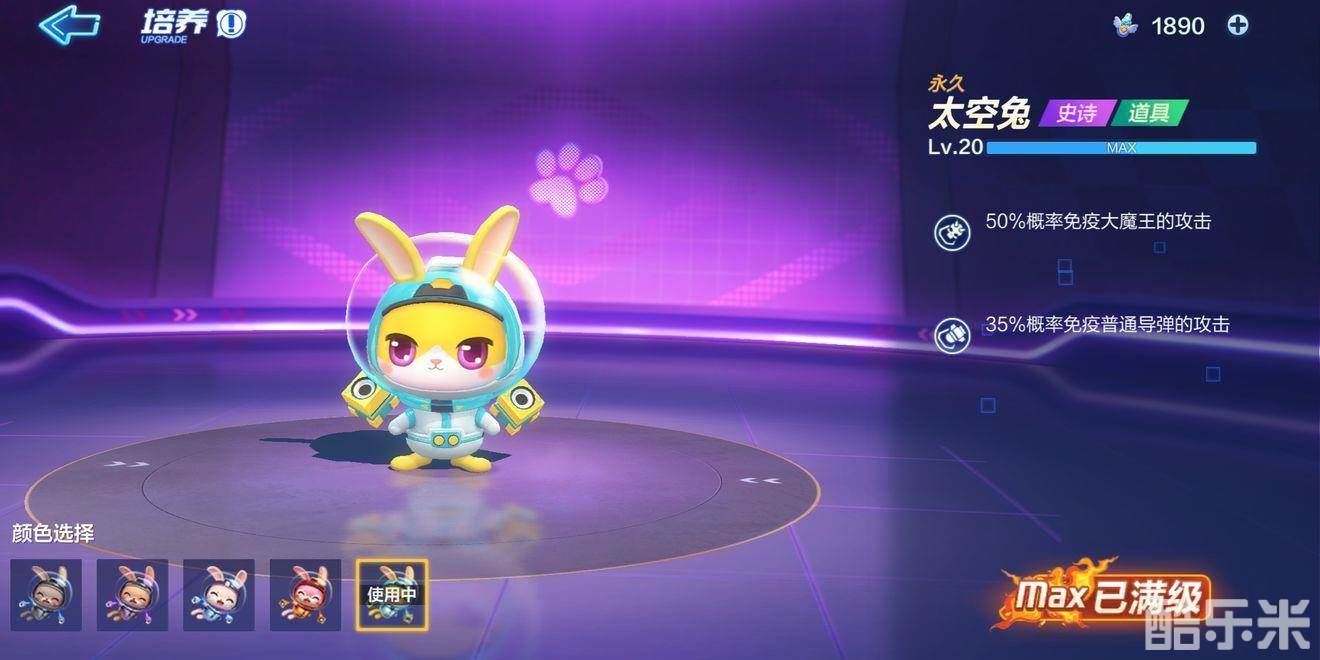 升满级后太空兔50%免疫大魔王,可以有效的防御敌人的攻击。太空兔主要分为1级、10级、15级三个阶段,每升一阶段都会让属性的概率增加一些。喜欢玩道具赛的玩家,太空兔性价比不错,喜欢玩竞速的玩家,那么就没有必要购买太空兔。2642个奶瓶才能满级,每天金币买限购80个奶瓶。5电池10个奶瓶,264210=264.25=1321电池,能省132元。