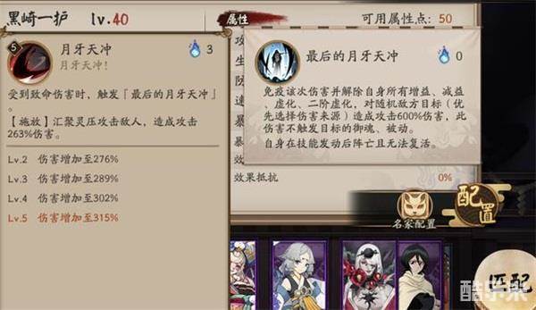 效果:受到致命伤害时,触发最后的月牙天冲,主动释放造成攻击263%伤害(满级后315%)