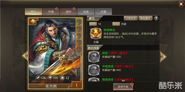 首先每个武将都有其定位,这个在点开每个武将的属性那里就能看到,以上图为例,虽然东方朔是个橙色品质的武将,按理说应该很强力。但他的定位是内政,其被动技能也都是跟资源生产有关,这样的一个武将如果你硬要他上阵杀敌,未免有点强人所难。