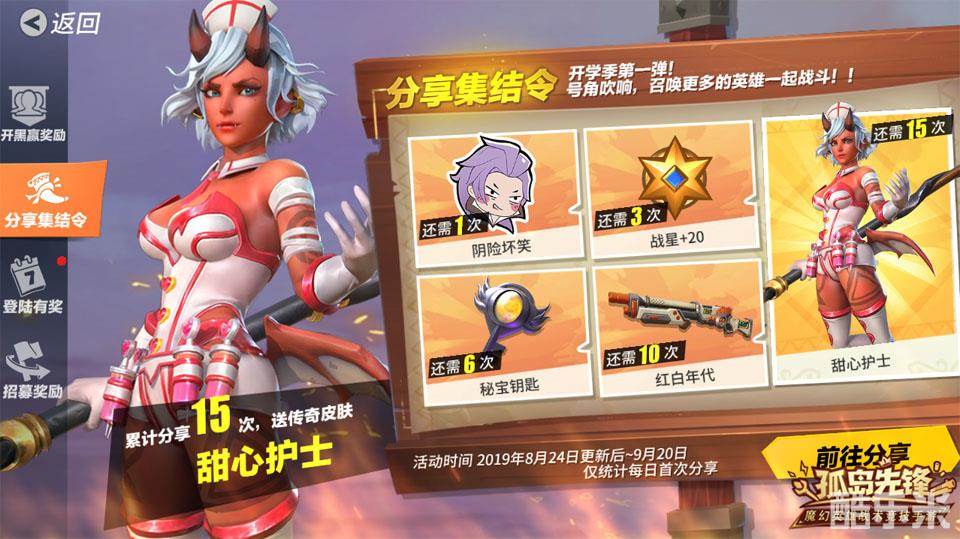 无论身处何地,分享永远使人快乐。临近开学季,《孤岛先锋》为玩家准备了奖励丰厚到泪流、分享即可免费领取的“集结令”活动。该活动将于周末正式开启,玩家只需登录并分享游戏,就可以积累分享次数,达到一定标准后即可免费领取喷漆图案、散弹枪皮肤、自选终级奖励等道具。