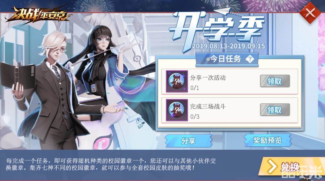 欧气满满,重回校园。9月开学季即将到来,《决战!平安京》也为大人们准备了开学季锦鲤活动,用福利与大人们一起迎接开学。8月23日起,完成游戏内指定任务,集齐全部7款专属徽章的大人,即可参与抽奖,有机会赢取全套七个校园皮肤哦!快来试试新学期的运气吧,也许下一个欧皇就是你!