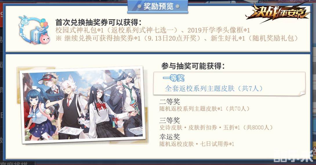 9月13日20点正式开奖,所有拥有抽奖券的大人,都将有机会获得随机一款校园皮肤(二等奖),史诗皮肤五折券(三等奖),更有机会赢取终极大奖:全套校园皮肤大礼包(共七个)。是时候展示真正的“血统“了!也许下一个“欧皇“就是你!