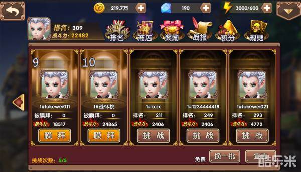 竞技场是pvp玩法,玩家挑战敌人,挑战成功后双方的名次互换,挑战失败后名次不变