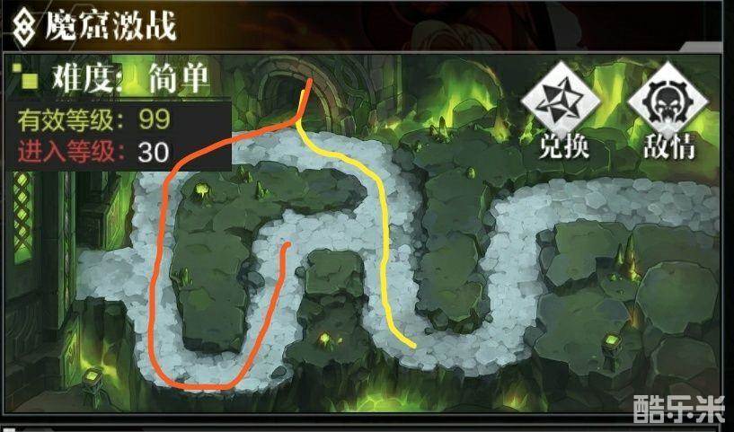 图中红线为战鼓兽行动路线,黄线为一般怪物行动路线(如果我没记错的话)推荐继续使用梅菲斯特与菲罗克忒忒斯的组合,站位可以选择红黄两线之间的高地。