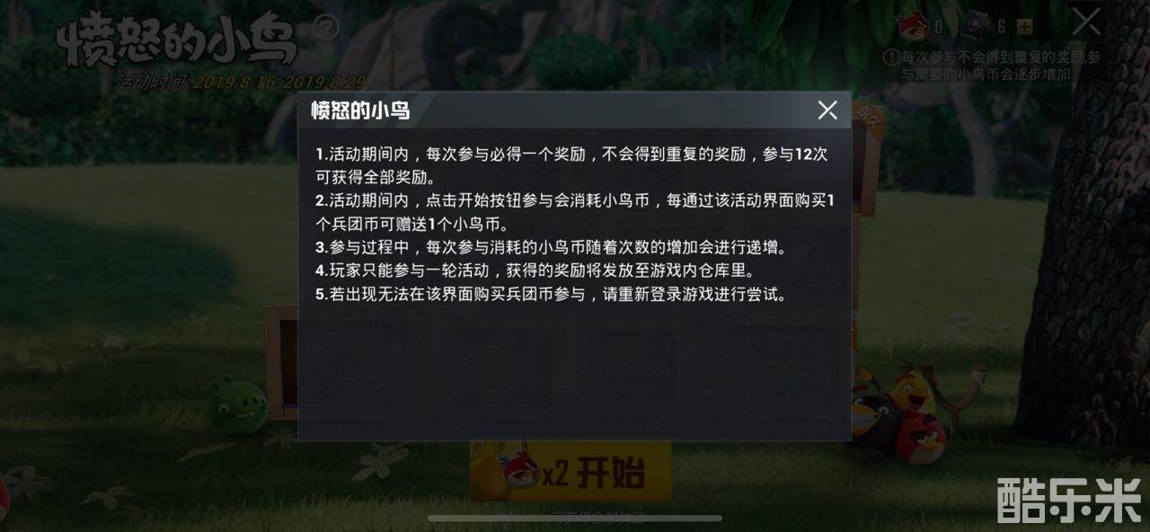 2. 活动期间内,点击开始按钮参与会消耗小鸟币,每通过该活动界面购买1个兵团币可赠送1个小鸟币。