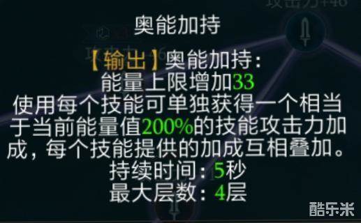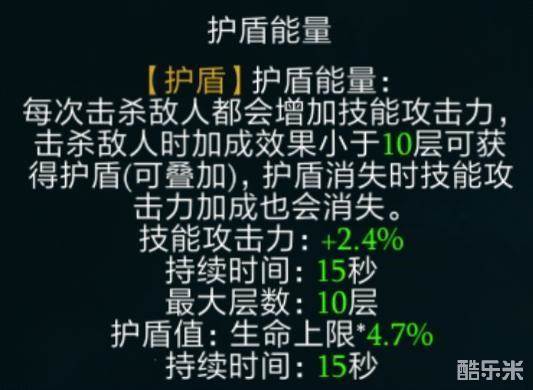“护盾能量”适用于除单挑之外的大多数玩法,击杀10个敌人后共可获得24%技能攻击力加成,持续15秒(再次叠加后可重置持续时间),24%的技能攻击力加成是非常高的,在后期的情况下能给予的加成甚至略高于“奥能加持”。