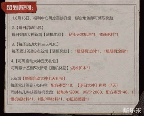 随着网易大神2.0版本更新,《明日之后》圈子新版福利中心也正式上线啦,每日签到即得海量福利!《明日之后》圈子福利中心在保留原本奖励的基础上,新增了随机试剂、随机涂膜、战术护木、心脏起搏器等奖励,签到即有几率获得!除此之外,还额外增加了“七日礼包”:玩家每周签到七天,即可获得配方残页*10和“明日大神”游戏称号(7天)!