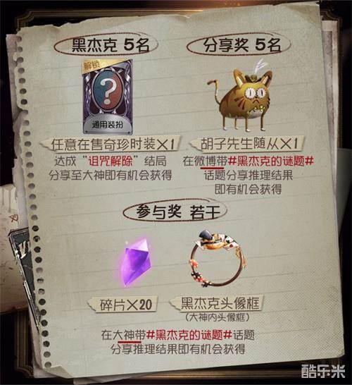 活动期间,达成“诅咒解除”结局并分享至网易大神,即有机会获得任一在售奇珍时装!绑定网易大神并在#黑杰克的谜题#话题下分享推理结果,还有机会获得20碎片和“黑杰克”大神头像框!迎接挑战,向未知的庄园探索吧,丰富奖励等你来拿!
