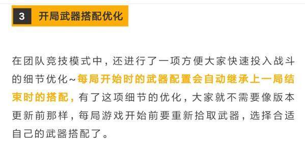 解析:在版本更新之前,玩家每次进入团队竞技都要重新选择自己喜欢的枪支,这无疑是繁琐的操作,影响了玩家的游戏体验,这一次的开局优化可以让玩家省去不少的配搭时间,将精力放在马上开始的游戏之中。