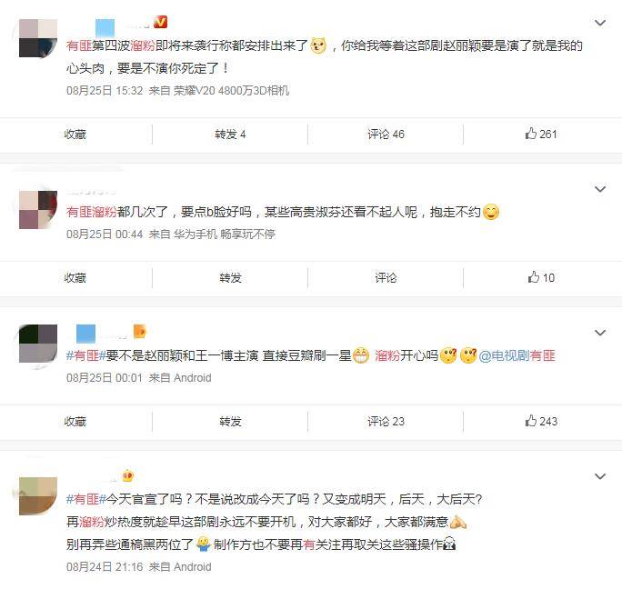 但既然还没有官宣,也不能百分百确定就是赵丽颖和王一博主演。而且,《有匪》剧组自2016年备案以来就一直爆出主演消息,却迟迟没有官宣和开机,溜过周冬雨陈晓、金晨朱一龙、关晓彤王鹤棣、李沁胡一天等等好几对演员,前段时间上热搜还是爆料的周冬雨和肖战主演,可谓是谁红溜谁了。这种溜粉的行为,导致《有匪》的口碑越来越差。