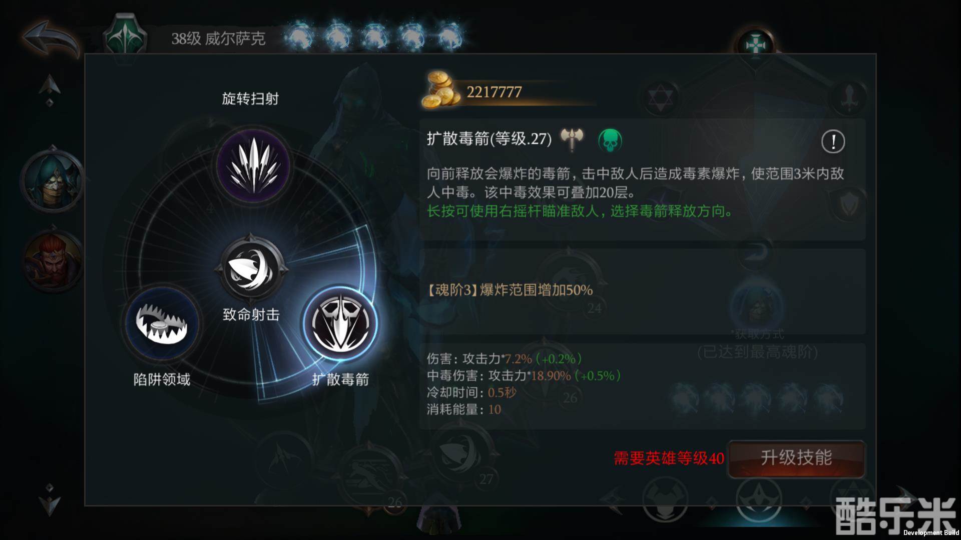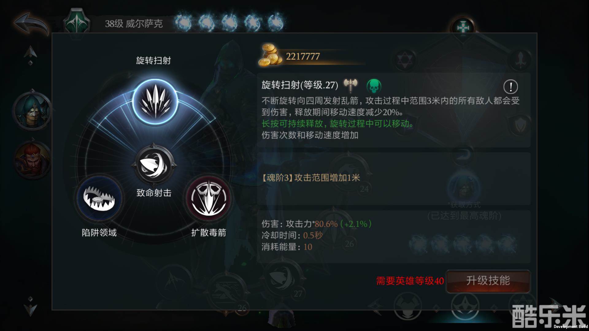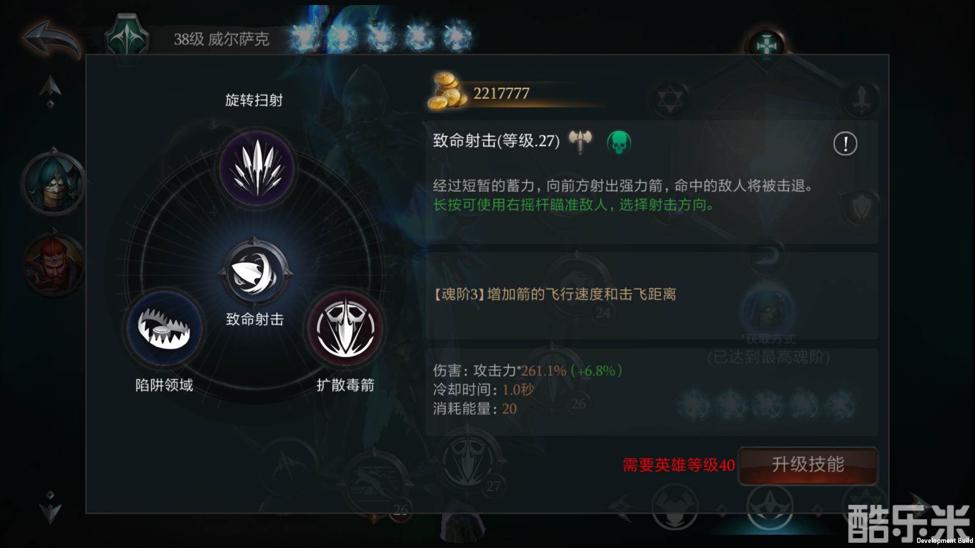 这就是系统初始默认的技能,在10级之前我们就能全部开启,4个技能分别是疾影、致命射击、回避射击(贴脸输出爆炸)、猎杀之影,这种技能的特点是强调英雄的灵活性,伤害在前期来说是比较高的,但等到英雄等级提升之后比较乏力,适合低等级刷副本所用。