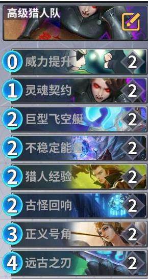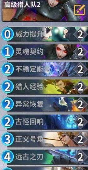 卡组:主要以增加威力为主,配合猎人打出高额伤害。“猎人经验”这张牌是针对猎人队专门带的,队伍中每有一名猎人,使我方目标英雄所有技能暴击+20。满编的猎人队就是加80暴击,加上英雄技能本身的暴击,基本上可以做到每下暴击(只要脸不是特别黑)。