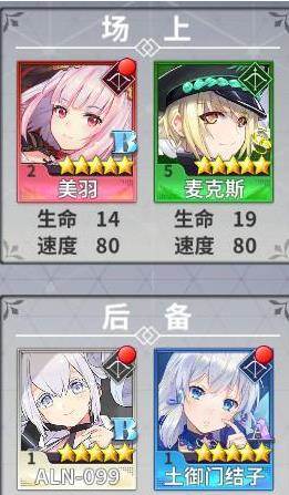 “高级猎人队”:麦克斯、美羽(首发)、土御门结子、ALN-099(替补)