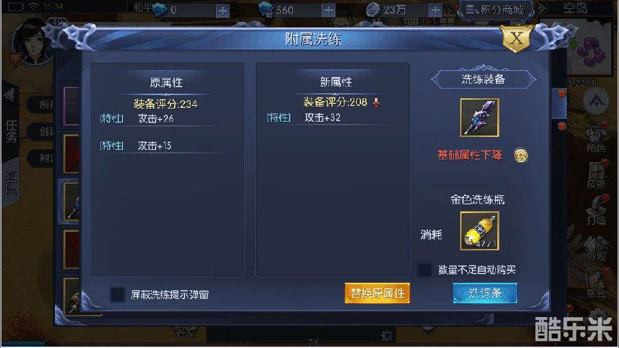 (1)如果洗练是装备属性强化(运气好),如下图,则选择点击替换原属性,即可获得洗练后的装备属性。
