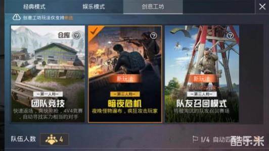 要想玩僵尸模式很简单,就在准备主界面的左侧的切换模式里,点击创意工坊就可以看到了,里面有4V4团队竞技、暗夜危机、队友召回一共三种模式。队友召回模式也是这次更新一起出的,这两种模式都没有什么特殊门槛,只要找到就能进行匹配。