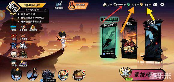 红色的箭头是忍币也就是游戏里最常用到的游戏币,可以用于忍者升级,兑换经验,神秘商店等等。主要的来源于jjc每一场都会给,每天的jjc收益上限是20w,反正lz比较咸鱼比较懒,从来没跑满过