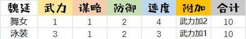 属性:3123,武力加1,共10点,属性方便我觉得两件都不错,舞女速度快一点点,泳装攻击高一些,当然自己还是更倾向于速度快的。