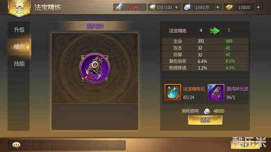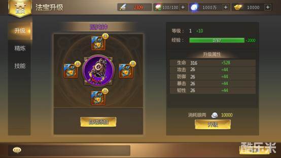 法宝系统主要包括“升级”、“精炼”、“技能”三个功能。