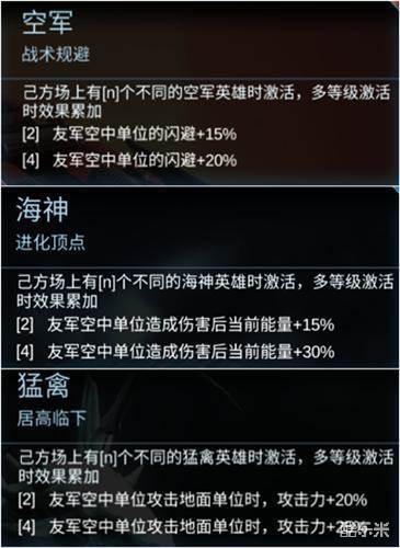 本阵容主要围绕空中单位来进行,而所有羁绊中,空军、海神、猛禽都能对己方空中单位的能力进行增幅。再经过爆破和攻城的进一步增强,使伤害达到一个非常恐怖的境地。抗揍方面有空军的闪避以及不朽的持续作战能力无需担心,骑兵对敌方单位大招充能的阻碍以及异能的加成也能保证队伍的续航。