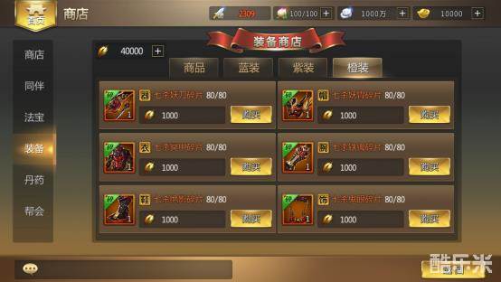 主角和同伴均可穿戴6个部位装备:武器、头盔、护腕、衣服、鞋子、项链。其中,武器有流派限制,只有对应的职业才可装备对应的武器(对同伴不影响)。此外,穿戴不同颜色的武器和衣服,可改变主角外观。普通装备可从主线闯关获得,而高品质的装备则主要从【装备商店】兑换获得。通过挑战【逆天之战】,获取龙鳞,即可在装备商店中兑换装备碎片。当集齐装备碎片,即可到装备界面合成整件的装备。
