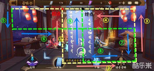 首先我们需要找到起点(需在白布的上面,红挂帘旁边),然后顺着步骤图的箭头的位置去画,其中①的结尾最好在单抽的中点线上,然后就是②直接横走到神龛的木头处,向上画③,然后到与起点平行的点向左画④,到灯笼外后向下画⑤,到红色挂帘须上的平行线后向右画⑥,然后直接到③的竖线后,沿线向下画⑦到底后,向左话⑧太极图右边附近,向上画⑨,直到终点。