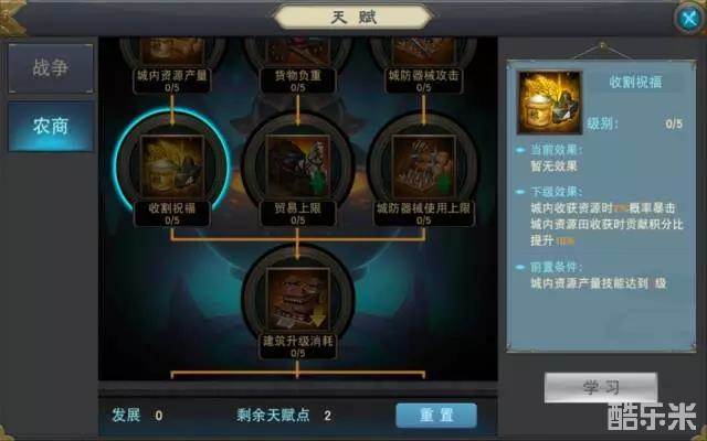 收割祝福:可以使城主在收集城内资源时有几率获得双倍的资源产出,并且双倍获得势力积分。这个天赋的随机性比较大,所以大家可以根据自己的实际情况选择加点多少。但是这个天赋至少要点一级,因为双倍的资源产出是非常可观的数目。
