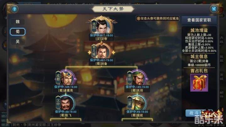 而由于魏蜀吴三国所拥有的州府数量,蜀国和吴国各拥有两个州府,而魏国拥有三个州府,州府的数量也代表了各方参加“三分天下”王城争夺战的势力数。