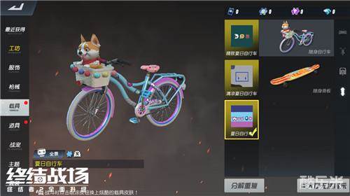 夏日自行车外形为复古风单车,前面的置物篮中放着可爱的汪星人,热烈奔放的颜色显示着盛夏氛围,车身上还有个性的涂鸦,与清凉夏日女性外观是绝佳的搭配,还可升级为清凉夏日自行车和精致夏日自行车。夏日自行车是游戏中第二款随身载具,玩家在排位赛准备区中可选择滑板或自行车作为本局比赛的随身载具,自行车还可搭载一名队友,极具实用性!