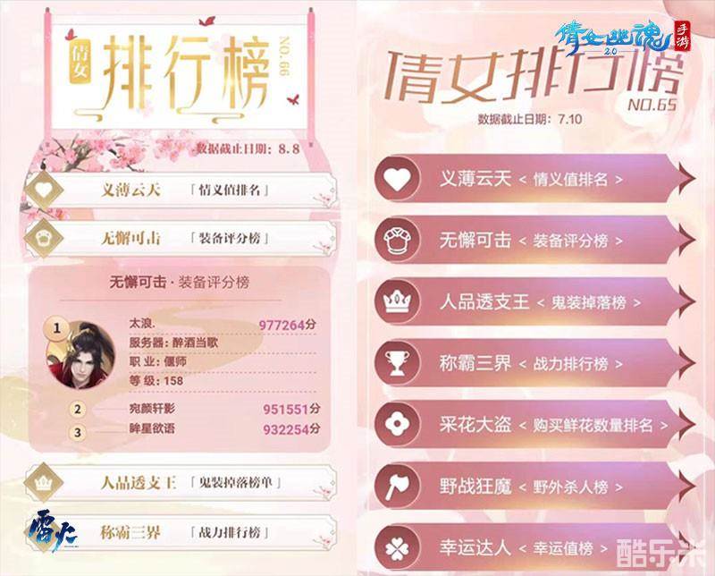 在本期膜拜榜中,装备评分榜和战力排行榜榜首为来自【醉酒当歌】服务器的玩家【太浪.】,两项评分分别达到了977264和1976691。而来自【雪中情】服务器的玩家【莫离づ涟漪】则以236件鬼装掉落成为本期人品透支王。本期膜拜榜中壕无人性榜首为来自【神雕侠侣】服务器的【眸星欲语】,送出红包总数为8492167800银两。另还有来自【雪中情】服务器的玩家【憶丶思哖】以1189476积分稳坐关宁积分榜榜首。其他更多精彩排行,尽在本期膜拜榜!