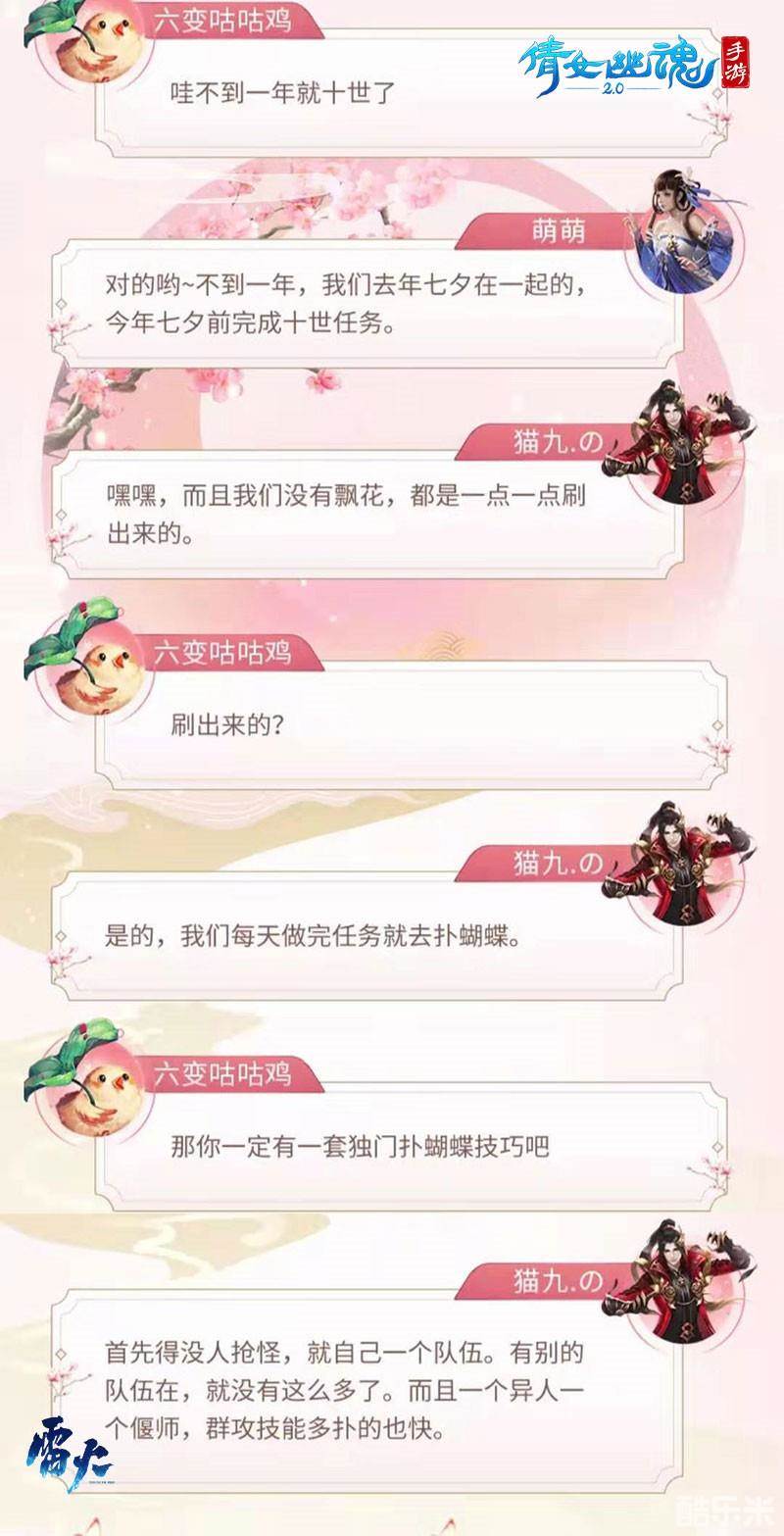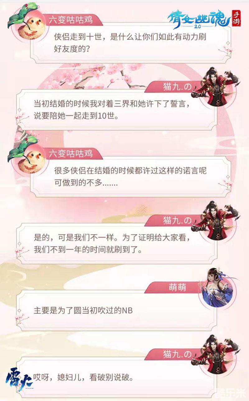 侠侣新婚,常许海誓山盟:十世相濡以沫,长久不分离。但380万亲密度要求如同高山,难以征服。【猫九.の】与【萌萌】这对侠侣征服这座高山只需一年,没有高调飘花,只是简单的每日陪伴,忙里抽闲上线看看,对方在线便一起去扑蝴蝶,无需特意追求,只是多陪一会彼此,不知不觉,友好度就够了。