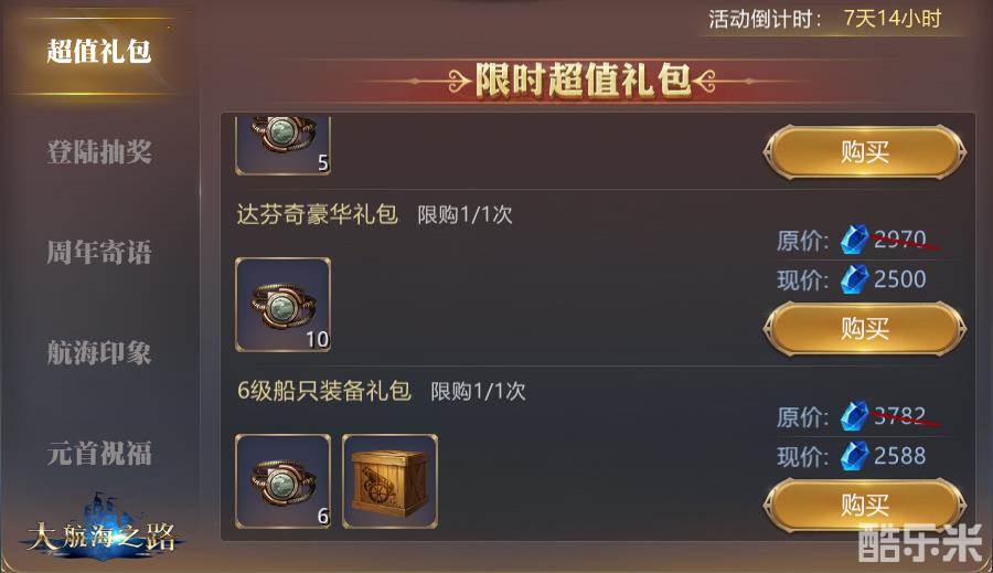 周年庆活动期间,船长们可花费一定蓝钻购买“装备强化部件礼包”,获得总计十个可随机提升人物装备某一属性的装备(每人限购2次),同时,船长还可购买6级船只装备礼包、达芬奇高手礼包等众多超值礼包,更有3周年船只徽章,3周年船只帆染等三周年专属外观道具等你来获取!