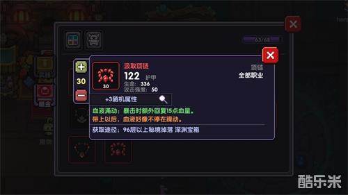 汲取项链,暴击吸血,暴击率够高你可以为所欲为,弹幕横着走,硬碰蜂王刺,不太可能,暴击率有但是总有间隙,游侠太脆,还是猥琐发育,这件装备主要就是补充一点生命恢复的短板