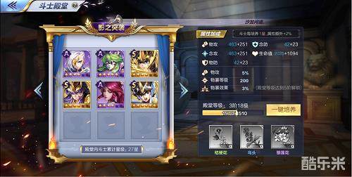 达到上述属性拥有着一定的难度,我们培养神星时应尽量靠拢,当然啦,如果你鲜花殿堂等级够高的话,初始物攻很容易就会达标,这样小宇宙中就可以放弃一些物攻百分比,去多堆一些速度和物爆等级,此外我们的斗士殿堂中的影之突袭和羁绊效果中,拥有着不少的冷门斗士诸如伽罗、莎尔娜、黄金箭.星矢、幼狮等,不要忘记给他们升级,这样我们的属性也能获得很大的提升。