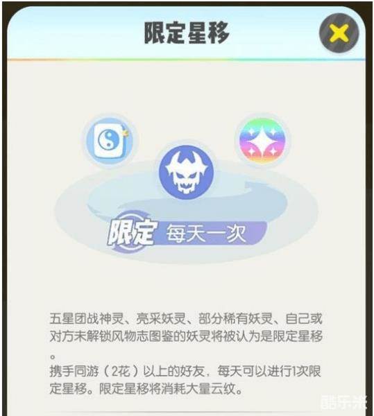 未开图鉴的玩家有福了,包括五星团战神灵、希有妖灵、或者自己及对方未解锁的妖灵将被认为限定星移,这类妖灵是否可以星移呢?答案是可以的,但是限定在伙伴2花以上,由于是未开启图鉴,开启限定星移将会消耗大量云纹,未解锁的妖灵每天只能一次,看来以后人手一支句芒了?