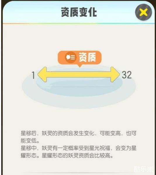 星移后的妖灵资质会产生变化,以目前1-32的资质来说,原本高资质的妖灵可能变低,也可能变更高,但是星移中有一定机率会收到星光祝福,星耀型态,意思就是原本狗粮的妖灵也可能受到星耀祝福变得高资质,而星耀的妖灵资质会比一般的更高!