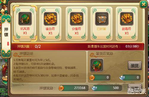红框内为本次押镖可获得的收益(押镖成功后),当箱子装满,就可以点击【出发】啦。镖车一旦出发,就表示自己拥有劫镖的机会了。