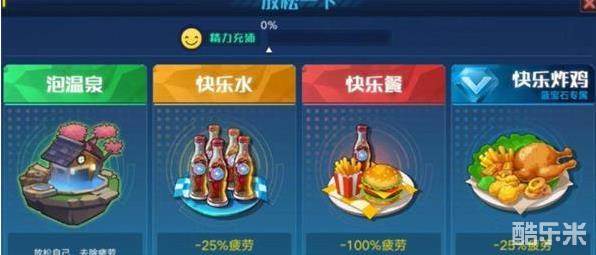 3.氪金:每个游戏都有氪金的大佬,想要快速的恢复体力值,对于那些不愿意浪费时间的氪金大佬们来说是再简单不过的事情了,点开体力值右边的减号除了有泡温泉之外还有其他三种方式,分别叫快乐水、快乐餐和快乐炸鸡,快乐水跟快乐餐是需要用星币购买的,快乐水一次性可以恢复25%的体力,快乐餐则是恢复100%。这里我们要注意的是快乐餐是无法购买的,只有蓝宝石专属用户可以免费领,效果也是恢复25%的体力。(提示:星币是游戏中的虚拟货币之一,需要用RMB充值获得)